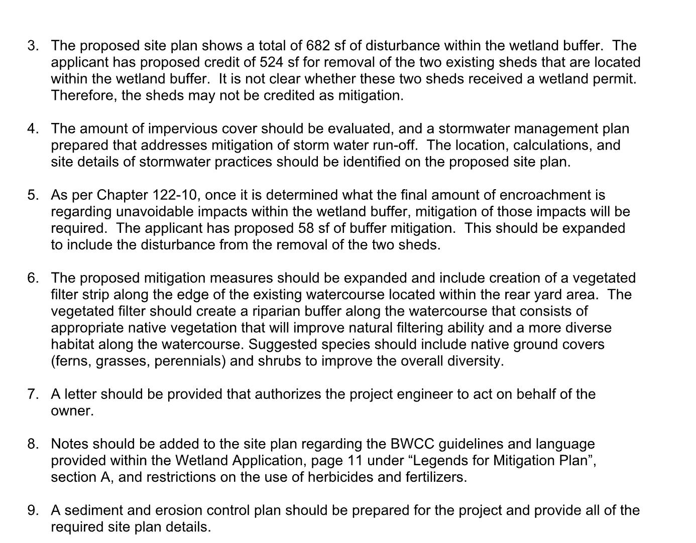 There are general guidelines that the Wetlands Consultant will provide for the specific property. While it's not an exhaustive list, we know that any future property would have similar requirements. So we could proactively make sure we've tackled the list before the initial Wetlands Permit submission.